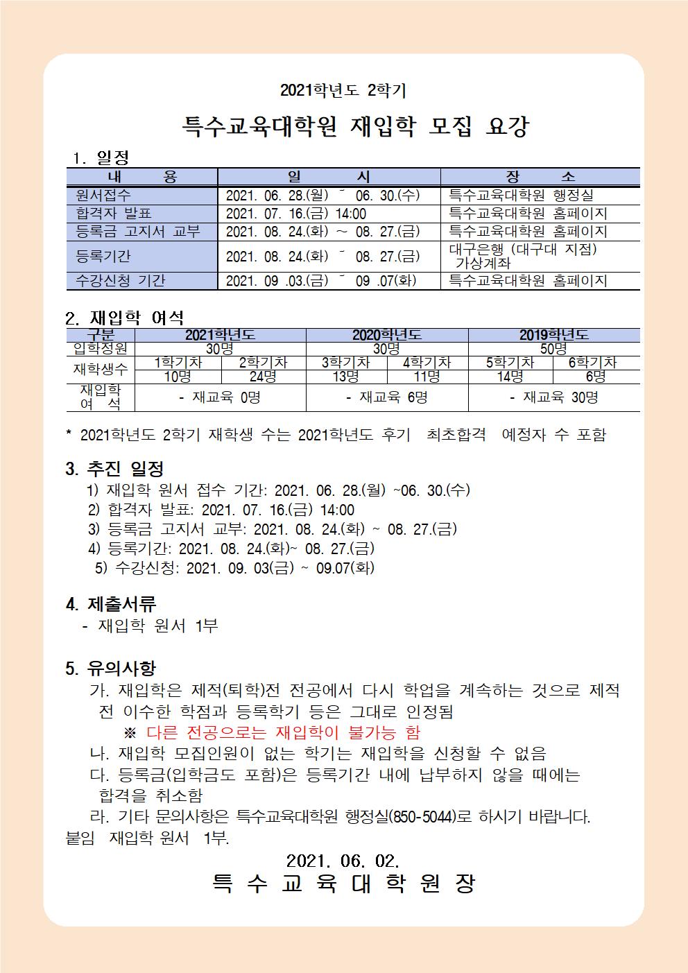 2021학년도 2학기 특수교육대학원 재입학 일정 안내