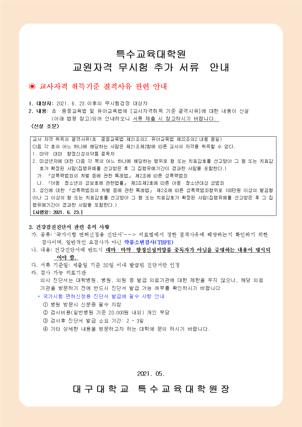 2021학년도 1학기 특수교육대학원 교원자격무시험 변경 안내