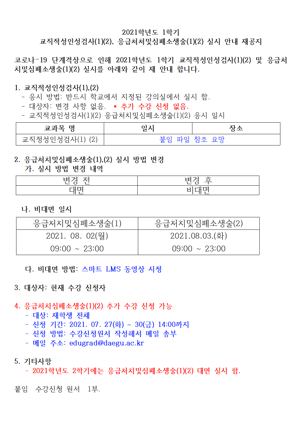 2021-1학기 교직적성인성검사 응급처치및심폐소생술 실시 안내 재안내