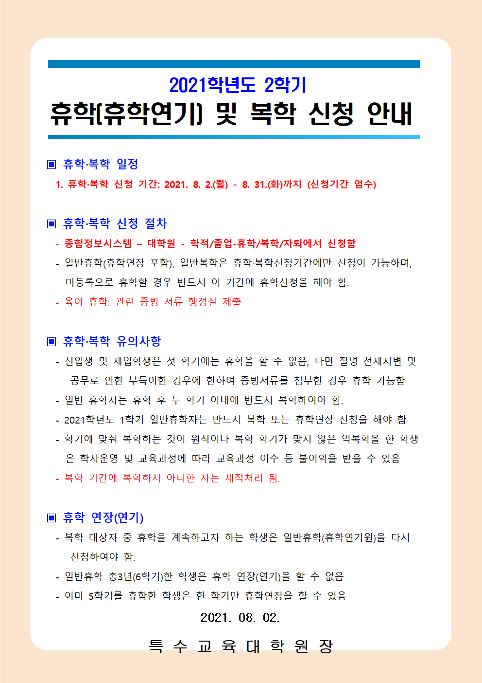 2021학년도 2학기 휴학(휴학연구) 및 복학 신청 안내