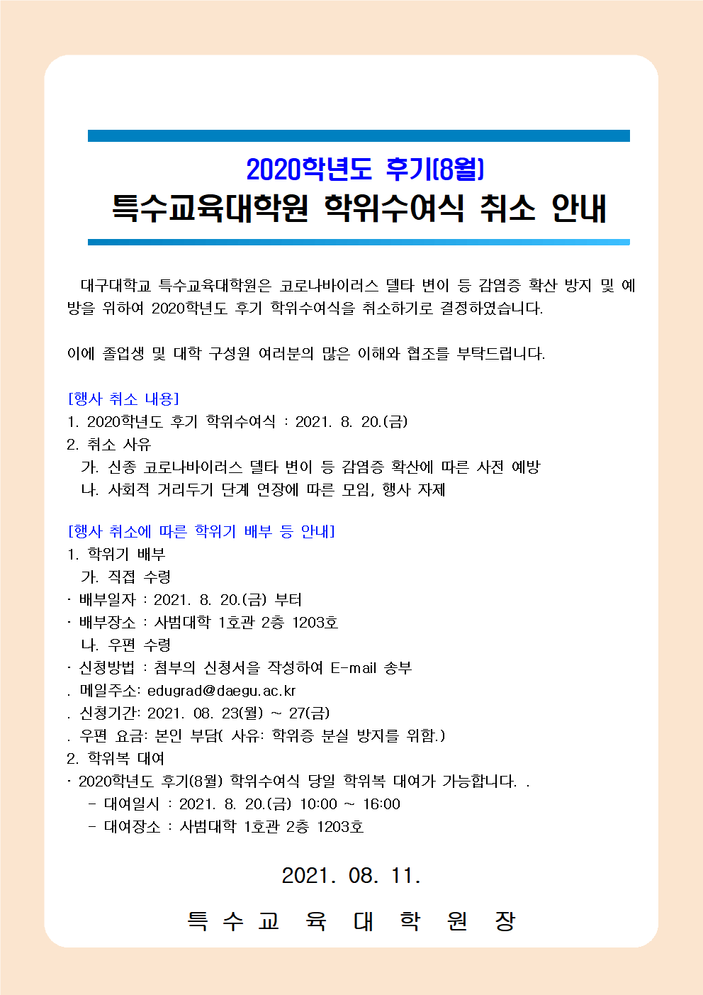 2020학년도 후기(8월) 학위수여식 취소 안내