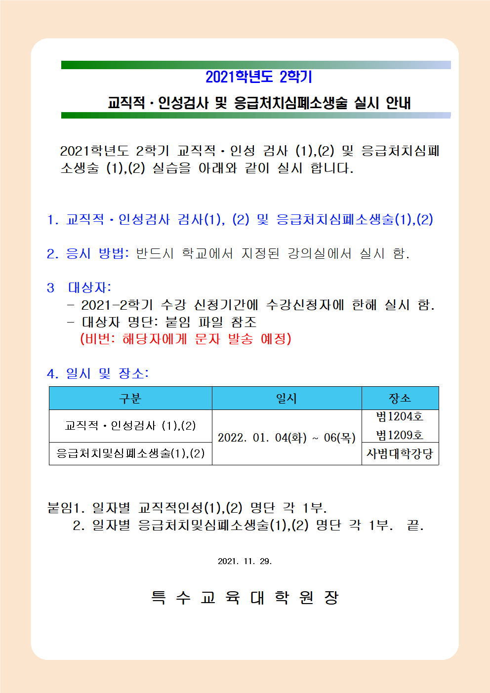 2021학년도 2학기 교직적ㆍ인성 및 응급처치심폐소생술 실시 안내