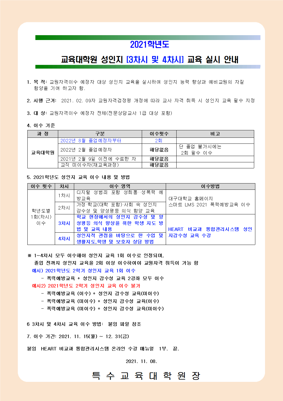 2021학년도 2학기 성인지(3차시, 및 4차시) 교육 실시 안내