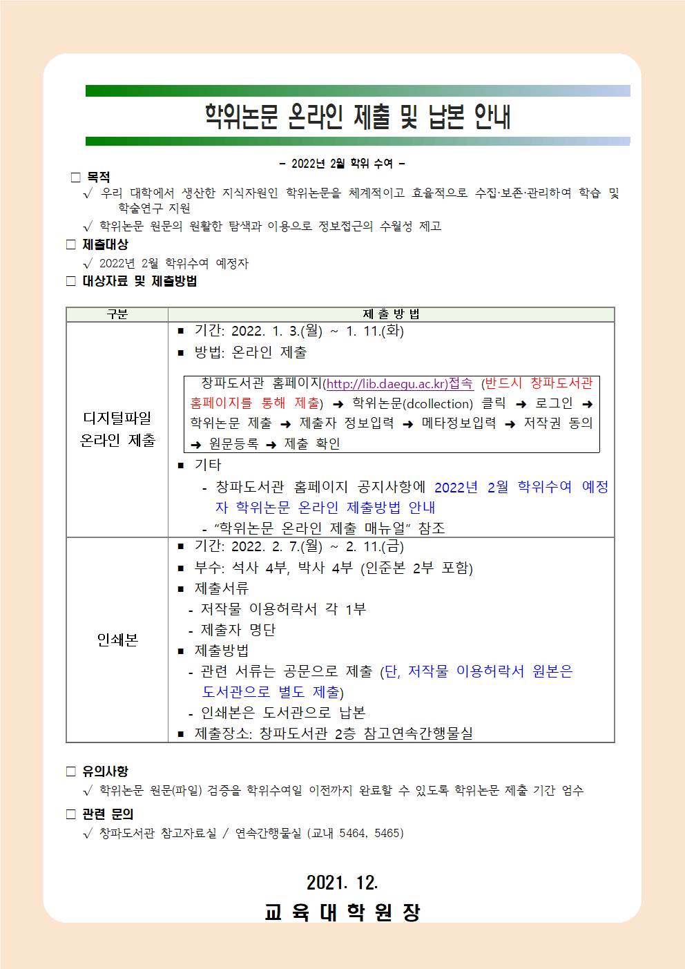 2022년 2월 학위수여에정자 학위논문 온라인 제출 및 납본 안내