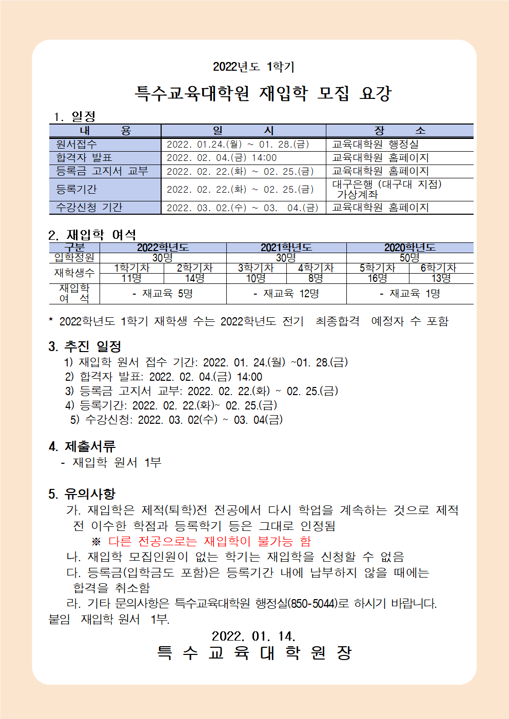 2022학년도 1학기 특수교육대학원 재입학 안내