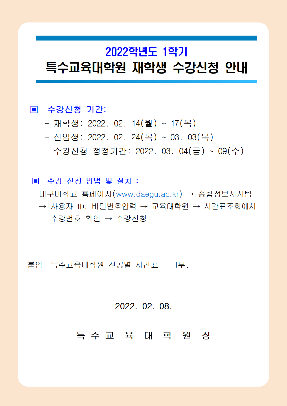 2022학년도 1학기 특수교육대학원 재학생 수강신청 기간 안내