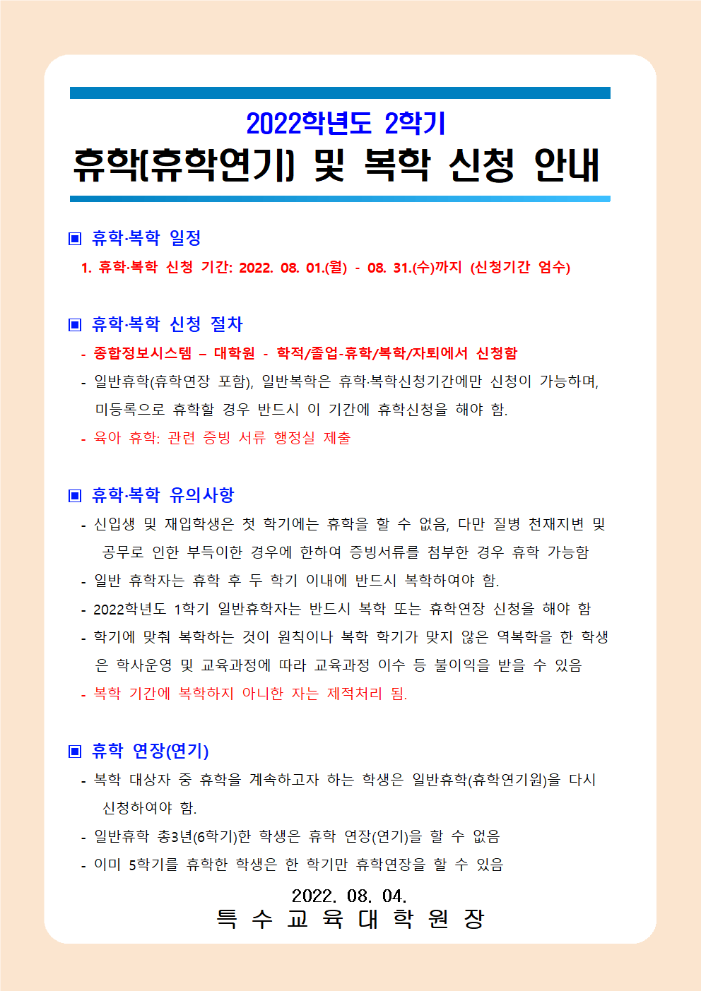 2022학년도 2학기 학적변동(휴학, 휴학연기, 복학) 신청 안내
