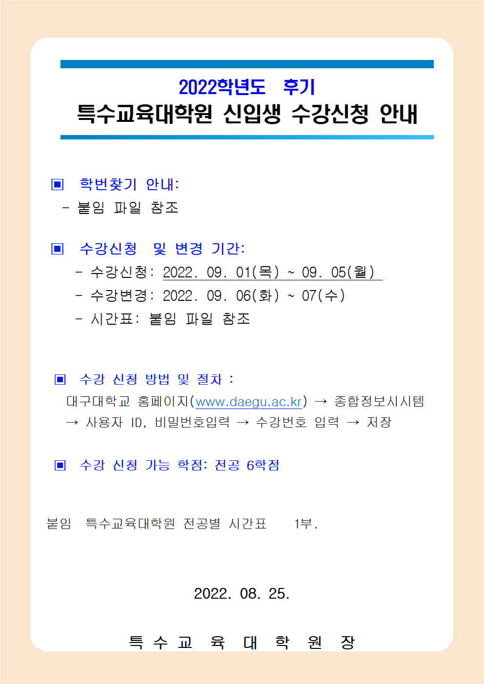 2022학년도 후기 신입생 학번찾기 및 수강신청 기간 안내