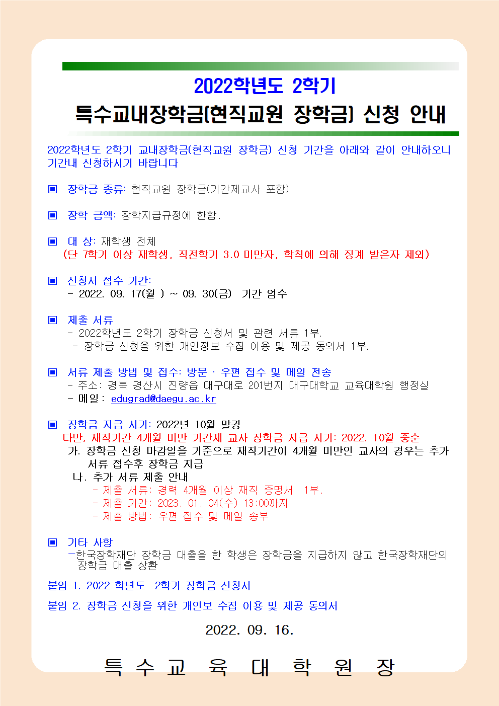 2022학년도 2학기 특수교육대학원 장학금 신청 안내