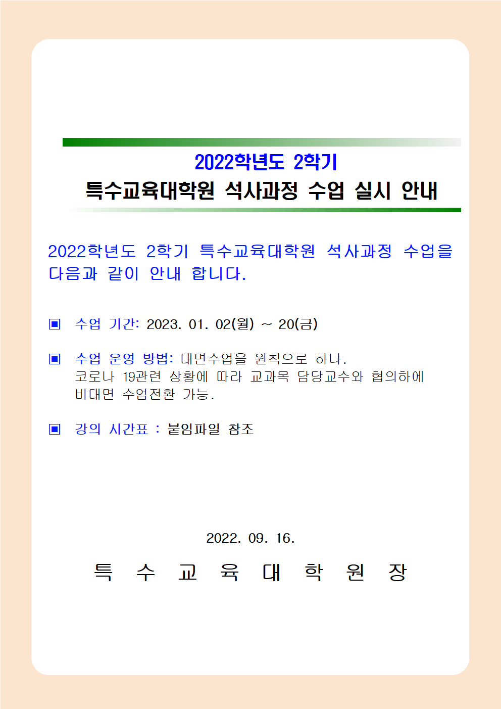 2022학년도 2학기 특수교육대학원 수업 실시 안내