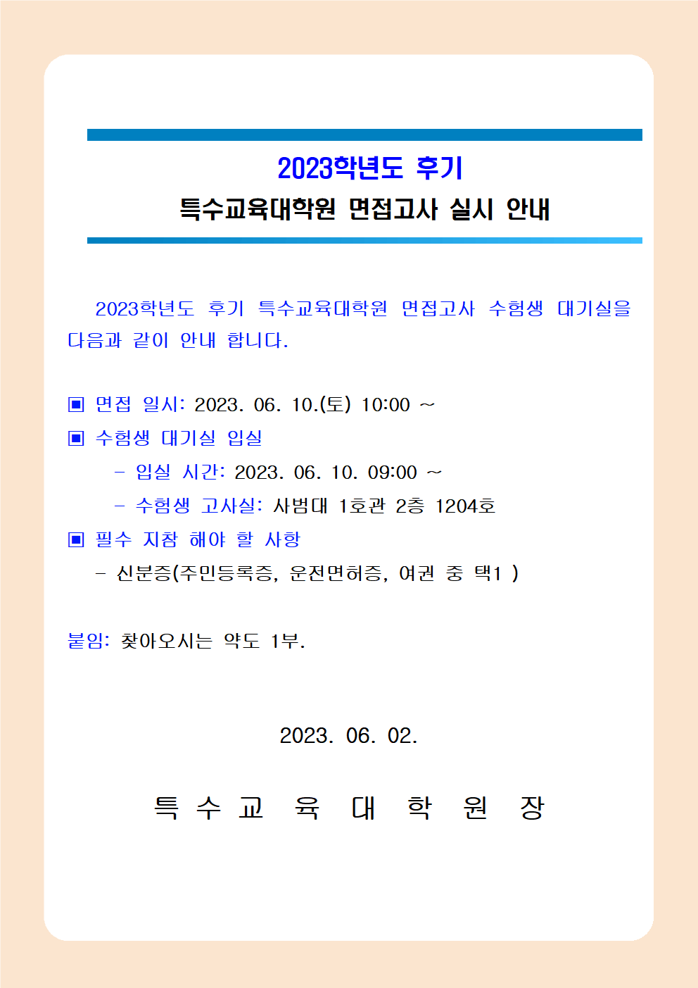 2023학년 후기 특수교육대학원 면접고사 실시 안내