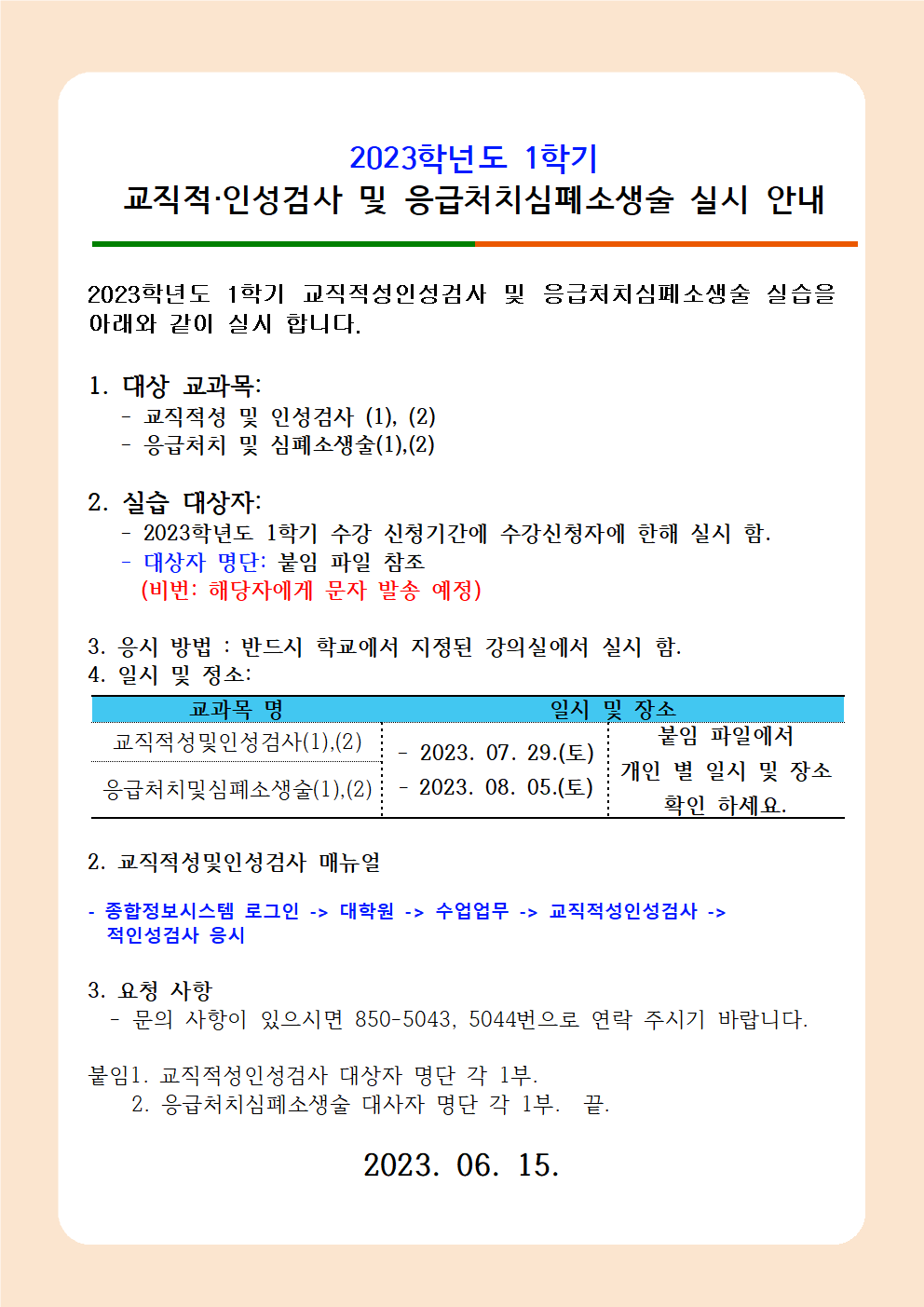 2023학년도 1학기 교직적성인성검사 및 응급처치심폐소생술 실시 안내