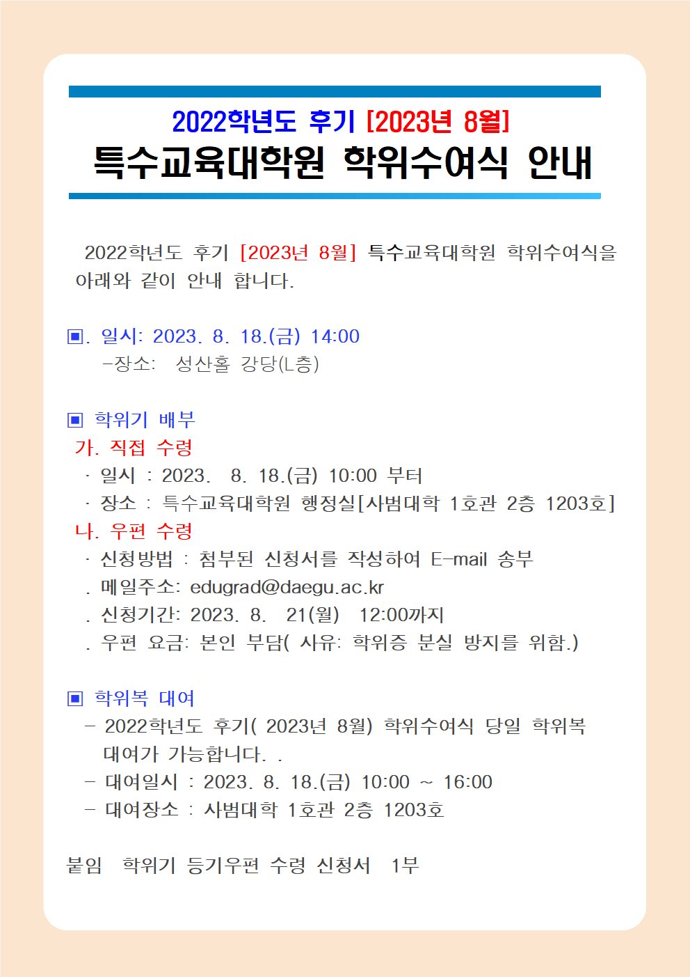 2022학년도 후기(2023년 8월) 특수교육대학원 학위수여식 안내