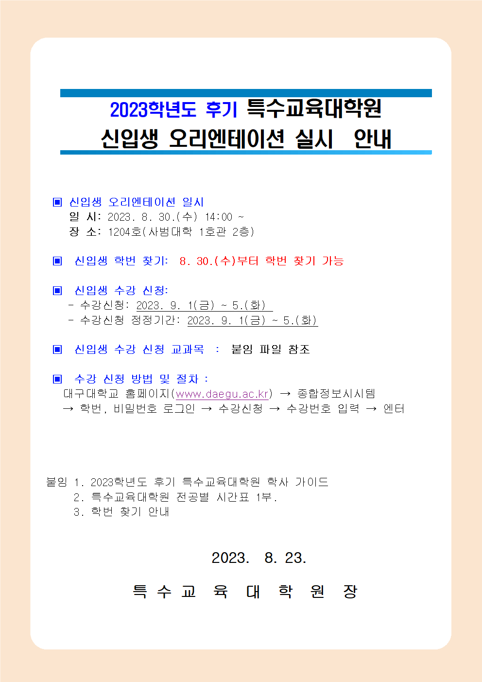 2023학년도 후기 특수교육대학원 신입생 OT 및 수강신청 안내