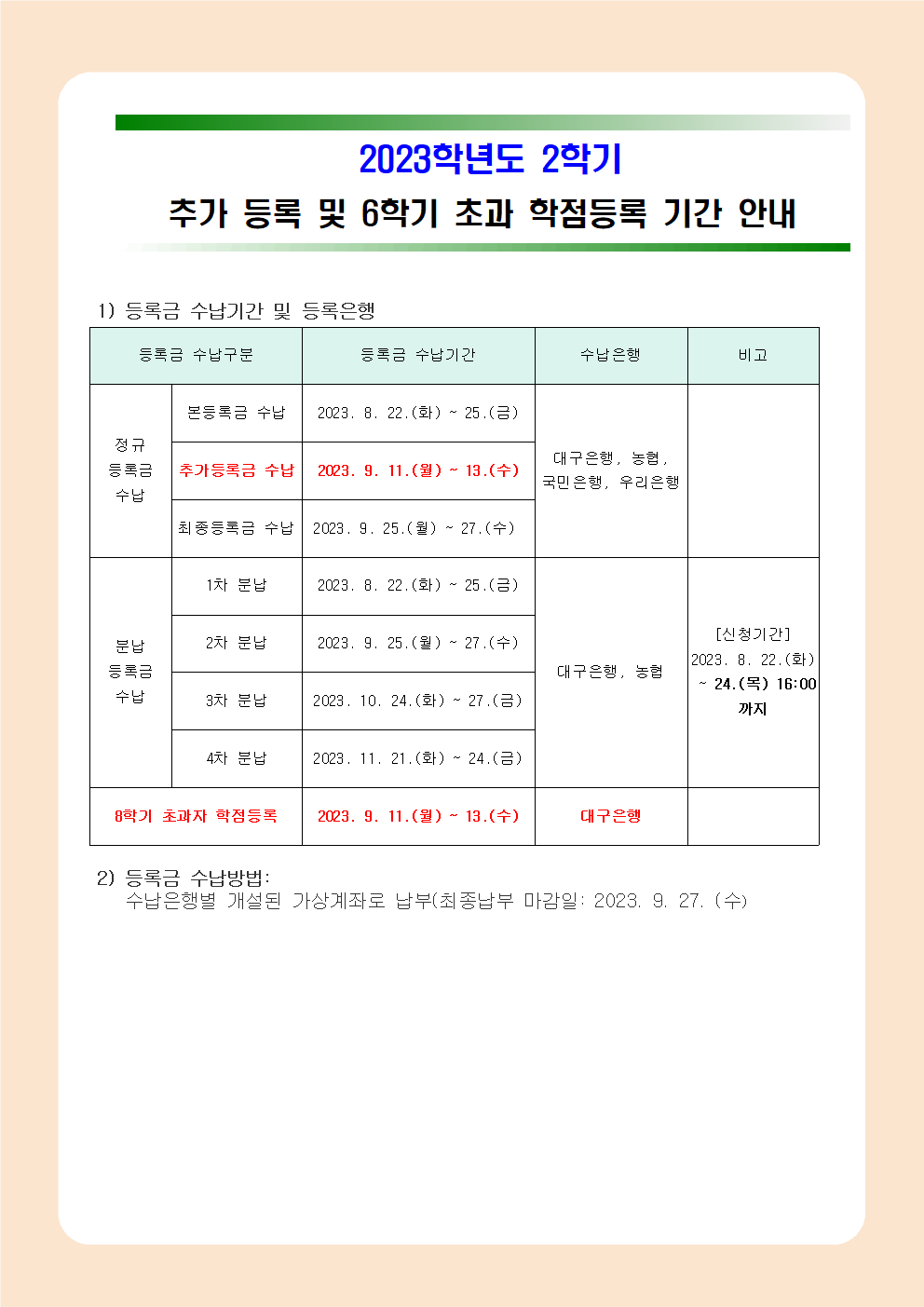 2023학년도 2학기 추가등록 및 6학기 초과 학점단위 등록 기간 안내