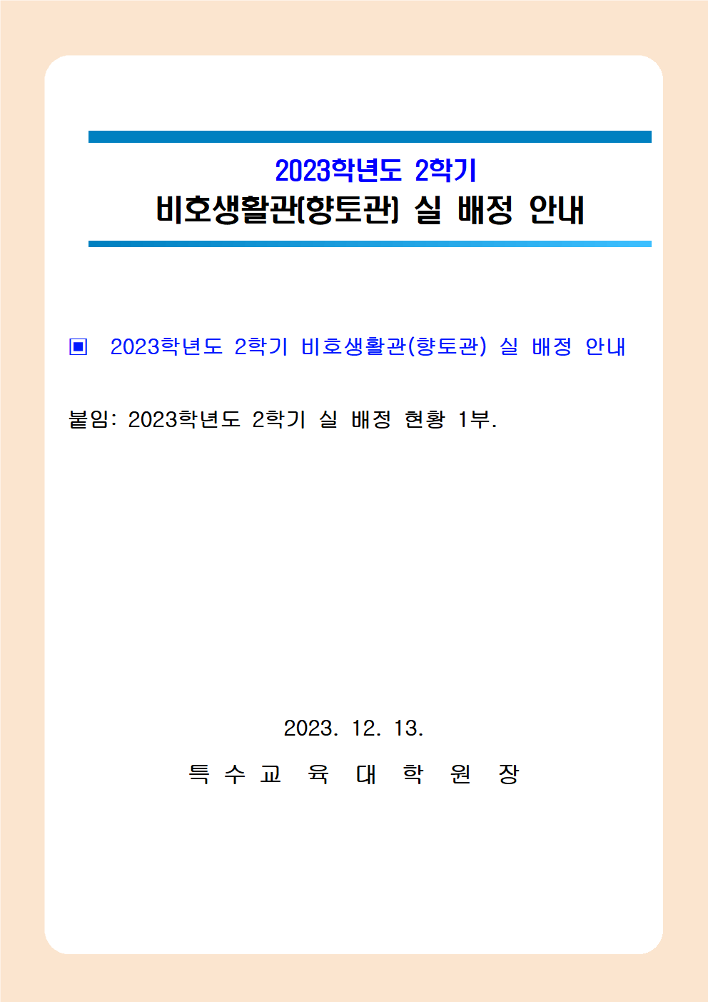 2023학년도 2학기 비호생활관[향토생활관] 배정안내