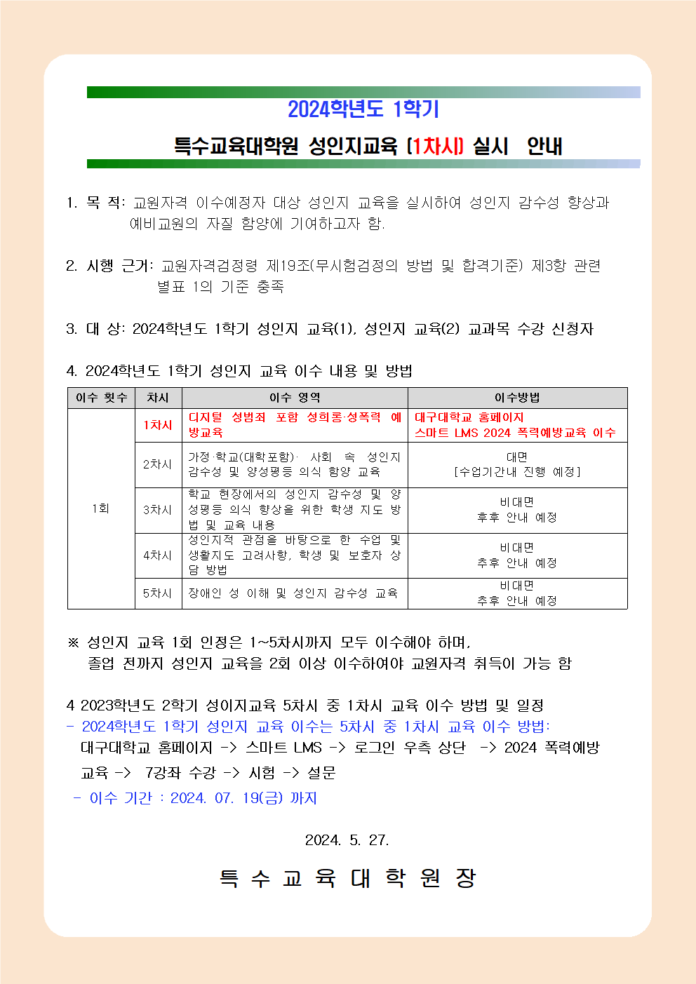 2024학년도 1학기 성인지교육[1차시] 실시 안내
