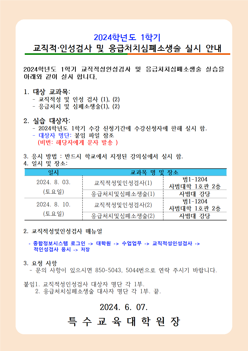 2024학년도 1학기 교직적성인성검사 및 응급처치심폐소생술 실습 실시 안내