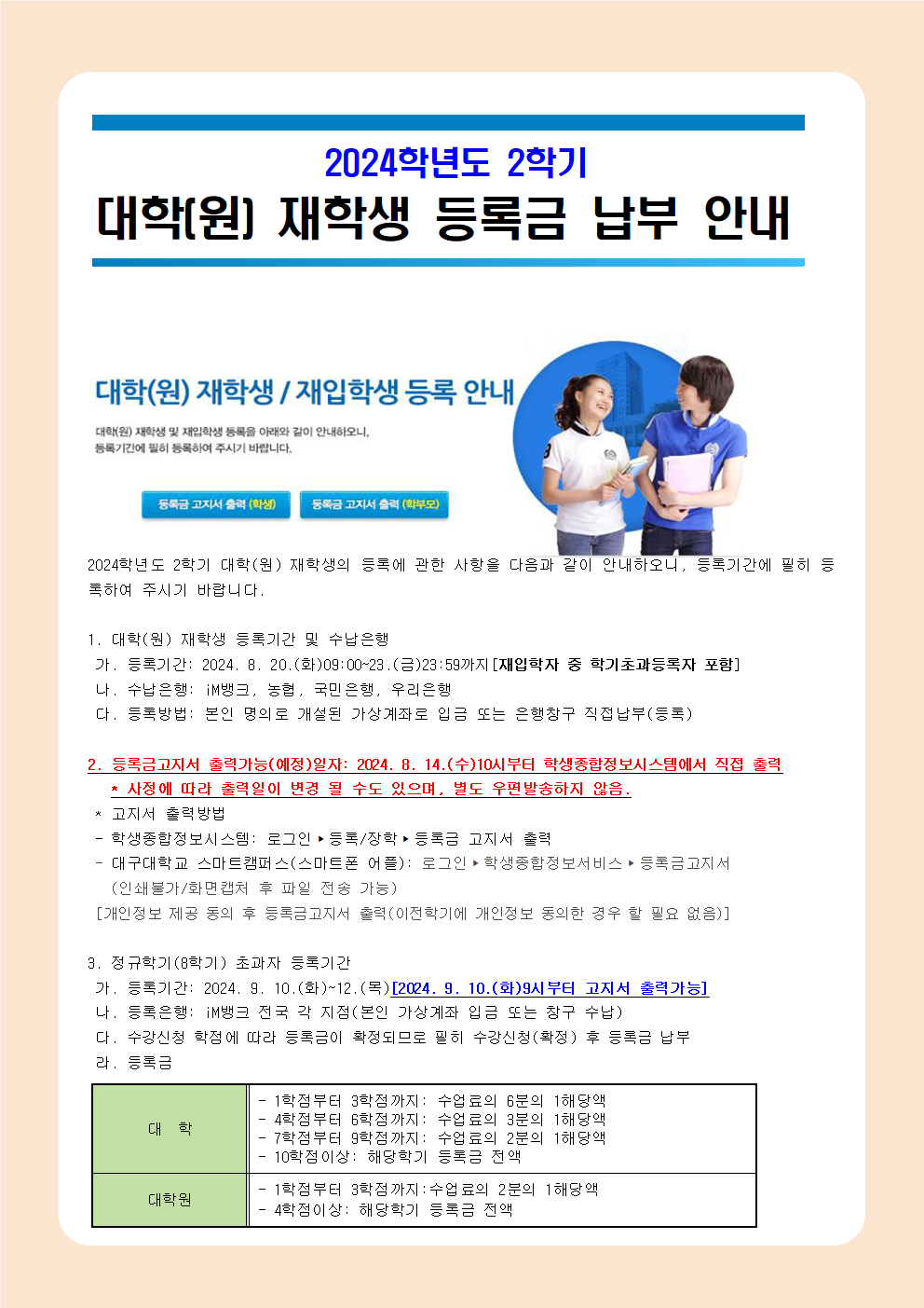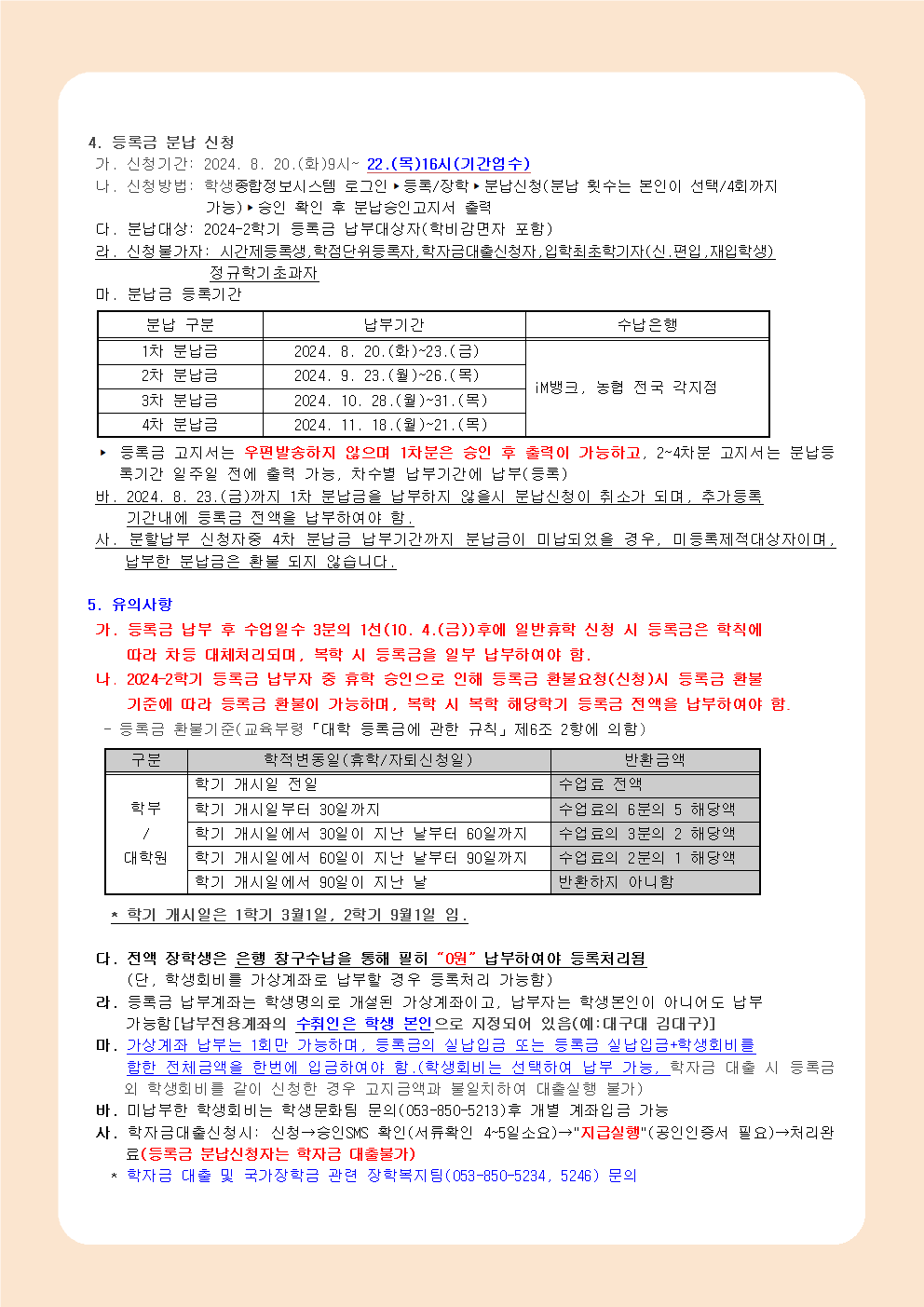 2024학년도 2학기 휴학(휴학연기) 및 복학 신청 안내
