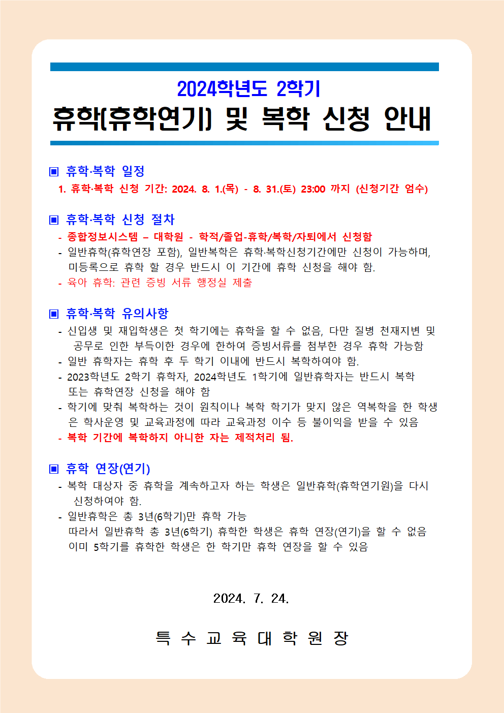 2024학년도 2학기 휴학(휴학연기) 및 복학 신청 안내