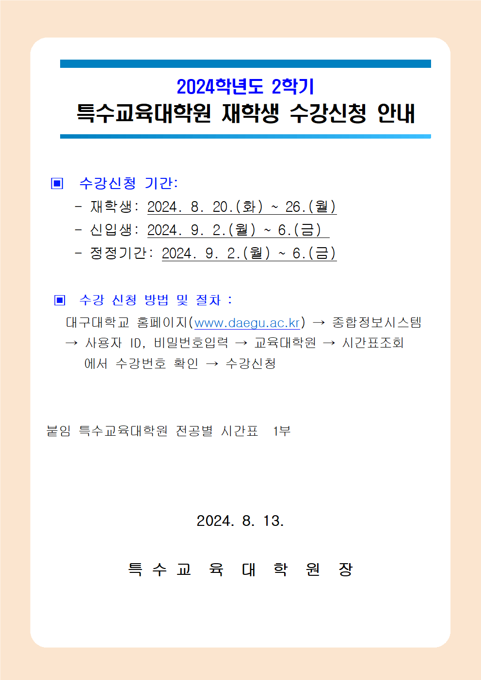 2024학년도 2학기 특수교육대학원 재학생 수강신청 기간 안내