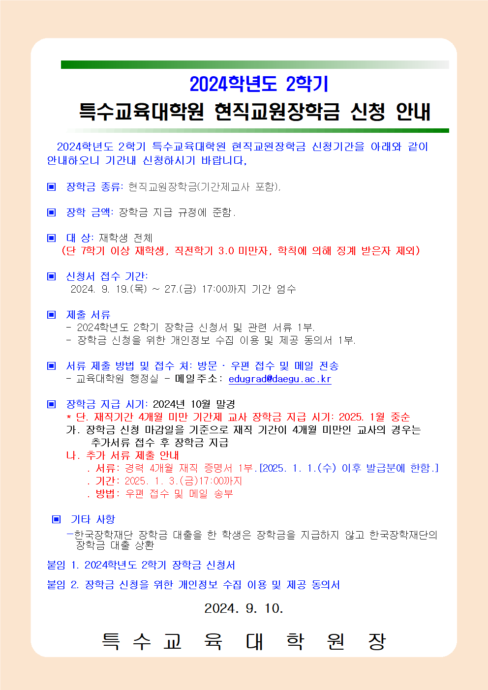 2024학년도 2학기 특수교육대학원 교내장학금 신청 안내