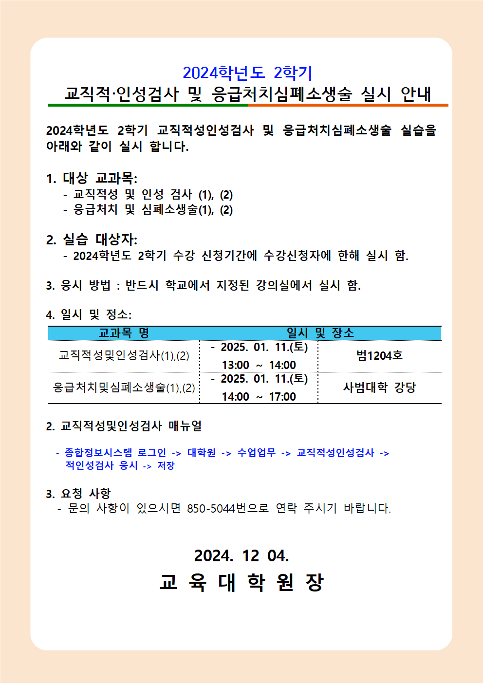 2024학년도 2학기 교직 적.인성 검사 및 응급처치심폐소생술 실시 안내