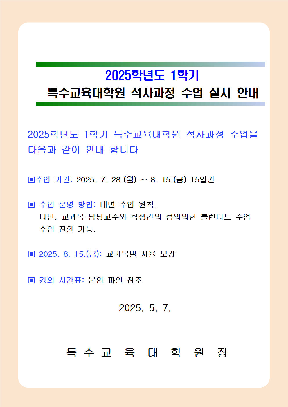 2025학년도 1학기 특수교육대학원 수업 실시 안내