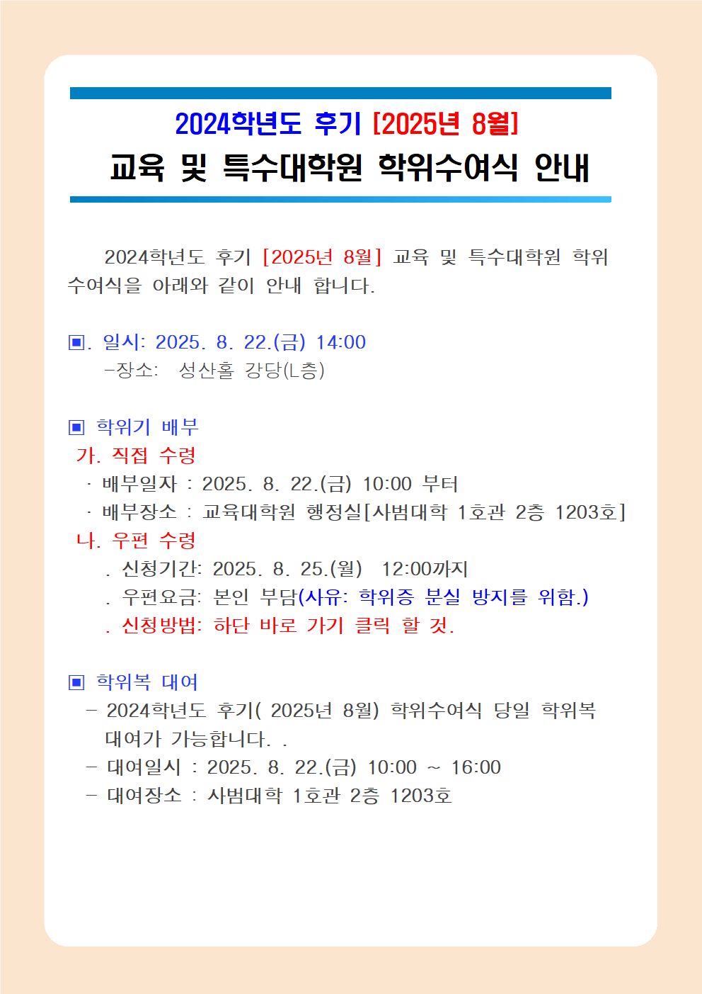 2024학년도 후기[2025년 8월] 특수교육대학원 학위수여식 안내