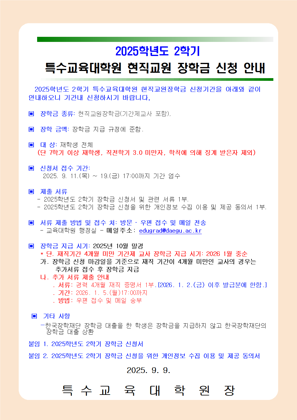 2025학년도 2학기 특수교육대학원 현직교원 장학금 신청 기간 안내