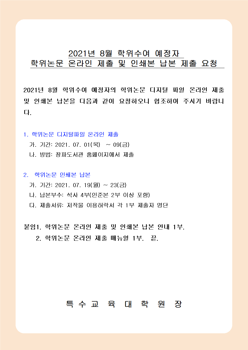 2021년 8월 학위수여자 학위논문 온라인 제출 및 납본 제출 안내