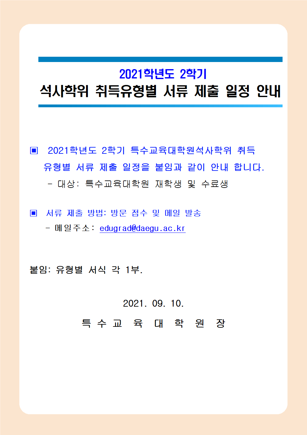 2021학년도 2학기 석사학위 유형별 서류 제출 일정 안내