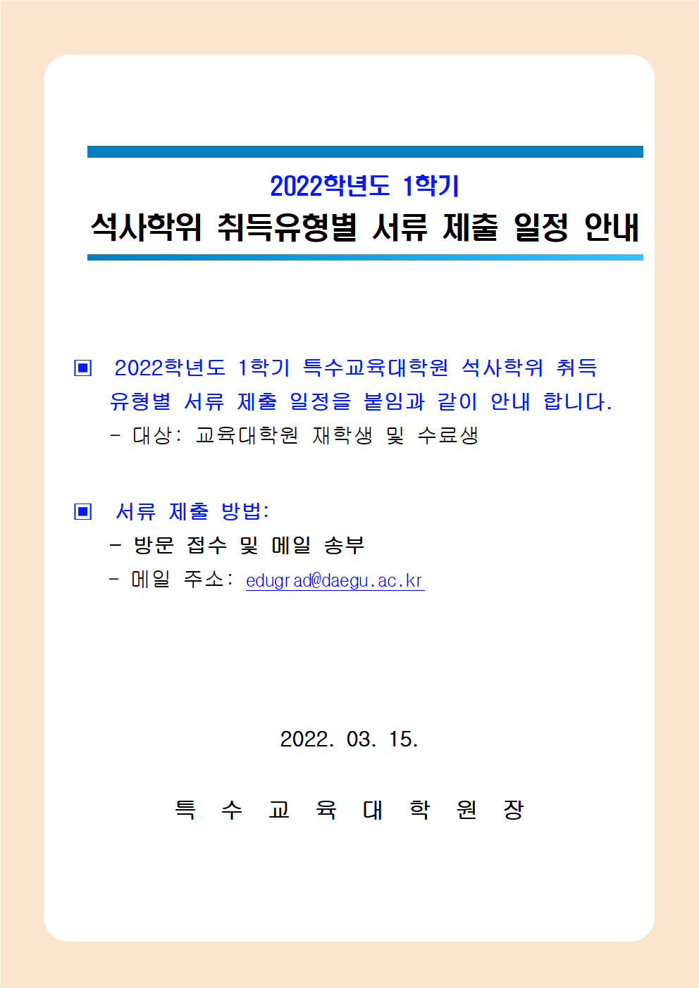 2022학년도 1학기 석사학위 취득 유형별 서류 제출 일정 안내
