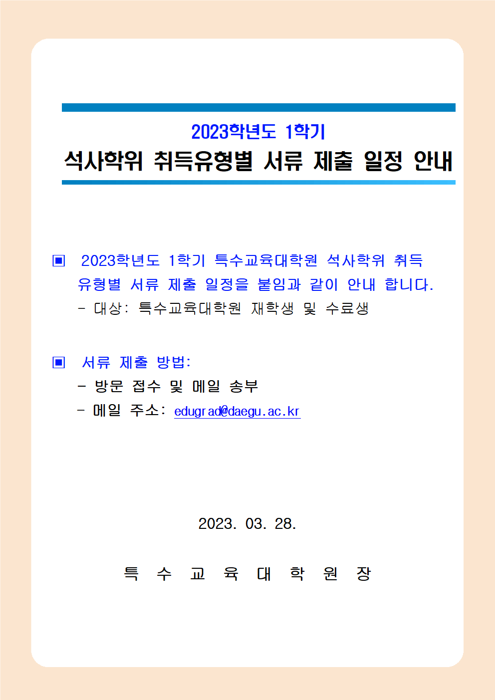 2023학년도 1학기 석사학위 취득 유형별 서류 제출 일정